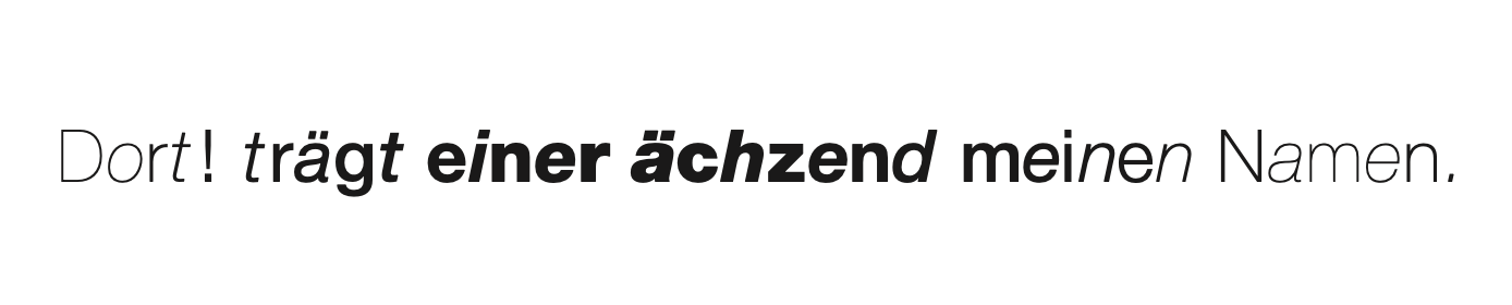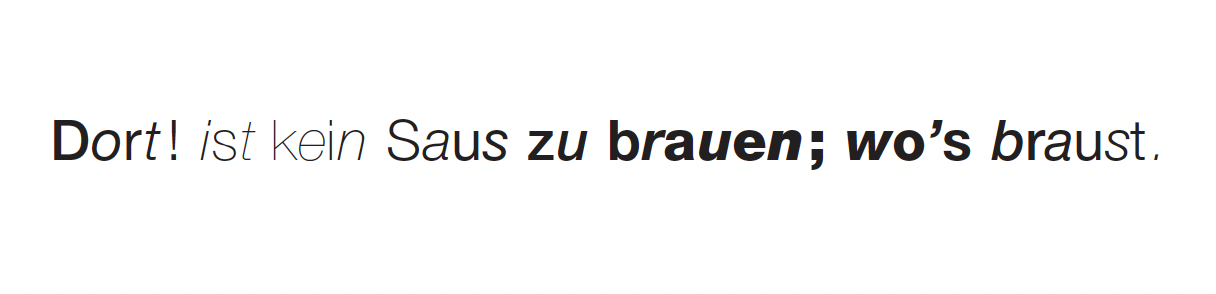 sind aus der Schriftfamilie „Neue Helvetica“ (Linotype) die folgenden Schriftschnitte, fortlaufend in auf- und absteigender Reihenfolge, verwendet worden: Helvetica ultra light, Helvetica ultra light italic, Helvetica thin, Helvetica thin italic, Helvetica light, Helvetica light italic, Helvetica roman, Helvetica roman italic, Helvetica medium, Helvetica medium italic, Helvetica bold, Helvetica bold italic, Helvetica heavy, Helvetica heavy italic, Helvetica black, Helvetica black italic.