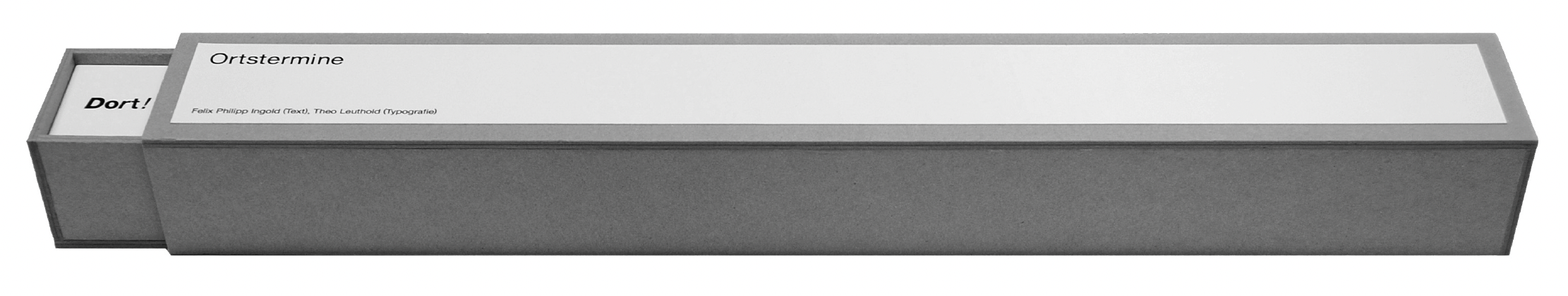 ein Text in Einzelzeilen, Sätze von unterschiedlicher Länge, ein Poem… Ich bin diesem Text in zwei Publikationen begegnet, in beiden sah ich ihn verschieden dargestellt: In der einen 115 Einzelzeilen, vertikal auf der Buchseite, jede Seite mit je sechs abwechselnd links- und rechtsbündig gesetzten Zeilen, die letzte Seite mit nur einer; in der andern, in von der ersten abweichender Reihenfolge, 116 horizontale, wegen ihrer Länge teilweise umbrochene Zeilen, zwischen ihnen Trennpunkte; beide Darstellungen über mehrere Seiten sich entfaltend… Für mich ein Faszinosum, ich schaue, ich lese. Der Text scheint sich gegen die Einzwängung ins Buch zu sperren, gegen das Eingesperrtwerden auf der Seite, vielleicht sogar gegen das Eingesperrtsein in seine eigenen Sätze… Das regt mich zu einer Lesart an, deren Ausdruck diese Textstreifen sind und die von diesem Eindruck bestimmt ist: Die einzelnen Zeilen des Textes – die, bis auf eine, alle mit der demonstrativen Ortsansage „Dort!“ beginnen – weisen beschreibend, plötzlich und eindringlich, das Ausrufezeichen markiert es, auf etwas, auf vieles hin, das ausserhalb des Satzes liegt; wie impulsive Ausrufe zu überraschend auftauchenden Bildern. Wenn dieser Eindruck richtig ist, dann ist es auch sein Gegenteil: Das „Dort!“ weist auf nichts weiteres hin als auf den nachfolgenden Satz selbst, es weist – selber ein Einwort-Satz – in diesen hinein, steht wie ein Satzkopf am Anfang der Zeile, wo das „Dort!“, wenn der Satz in Leserichtung bis zum Schlusspunkt vorangekommen ist (besser: wenn der Autor ihn soweit vorangetrieben hat), dann zu dessen anderem Ende geworden ist… Vielleicht ist also das nun mein Versuch, so denke ich im Nachhinein, eben diesen Aspekt typografisch augenfällig zu machen: Durch die Abfolge der abgestuften Schriftschnitte setze ich einen Focus, der alle Gedichtzeilen zu durchlaufen scheint, mal heller mal dunkler, und der, unscharf, auf zufällige Text-Orte fällt, ohne jedoch stehen zu bleiben… Die kursiven Schriftschnitte geben den Anschein von Fortschreiten, Vorankommen, was jedoch durch die geraden Schriftschnitte unmittelbar aufgehalten wird: eine virtuelle Bewegung, ein Schwanken, die Bewegung hält inne, der Stillstand scheint voranzudrängen… Für die präzise typografische Form dieser Illusion und für die notwendige Leserlichkeit des so inszenierten Textes habe ich alle Buchstaben – ebenso wie die Wortzwischenräume – optisch, soweit möglich, ausgeglichen, da derart verwendete Schriftschnittkombinationen in der Gebrauchstypografie keine Verwendung finden und deshalb in den Parametern der Schriftzurichtung nicht berücksichtigt sind. Was dort sinnlos ist, weil es an andern Wahrnehmungskriterien gemessen wird, scheint im Raum des Poetischen und dessen Inszenierungen Sinn erst möglich zu machen: Augensinn… Ich könnte auch sagen: Ich habe das Gedicht nicht nur wörtlich genommen, sondern buchstäblich, zwischenräumlich, womit ich über mein Textverständnis jedoch wenig aussage, das vielmehr einem Mutmassen und Projizieren gleicht, bleibe ich doch allein dem gedruckten Text gegenüber, der alle Fragen nur mit Schweigen beantwortet… Mit dieser markanten Zeicheninterpretation bin ich möglicherweise auf Holzwegen unterwegs, da das Gedicht der Körperhaftigkeit der Staben und der typografischen Repräsentation wahrscheinlich nur in dem Mass bedarf, wie es auch das Lesen braucht, das innerliche Sprechen, noch mehr: die Stimme des vortragenden Autors, die akustisch vernehmbaren Modulierungen der Sprachfiguren, Bezüge, Bögen, Pausen, Sprünge, die vieles mit anderem in etwas aufgehen lassen, das zu lautpoetischen Impulsen führt, Assonanzen würden hörbar: Dort und Wort, das Wort als Tor Dort… Solches Sprechen würde, so stelle ich mir vor, szenische Gedanken evozieren, deren Betrachtung vor Ort nur in der Imagination der Hörenden passieren könnte, zu der ein Ortstermin nur hintäuscht, ebenso wie das Wort „Dort!“ als Ort es tut, das durch sein demonstratives Gebaren auch von einer Geste (ich stelle mir vor: ausgestreckter Zeigefinger, weisende Hand, vorgestreckter Arm, heute bekleidet, vor Zeiten nackt) zu sprechen scheint, die auf einen Moment hindeuten könnte, wo Sprechen anfängt, Handlung zu begleiten…