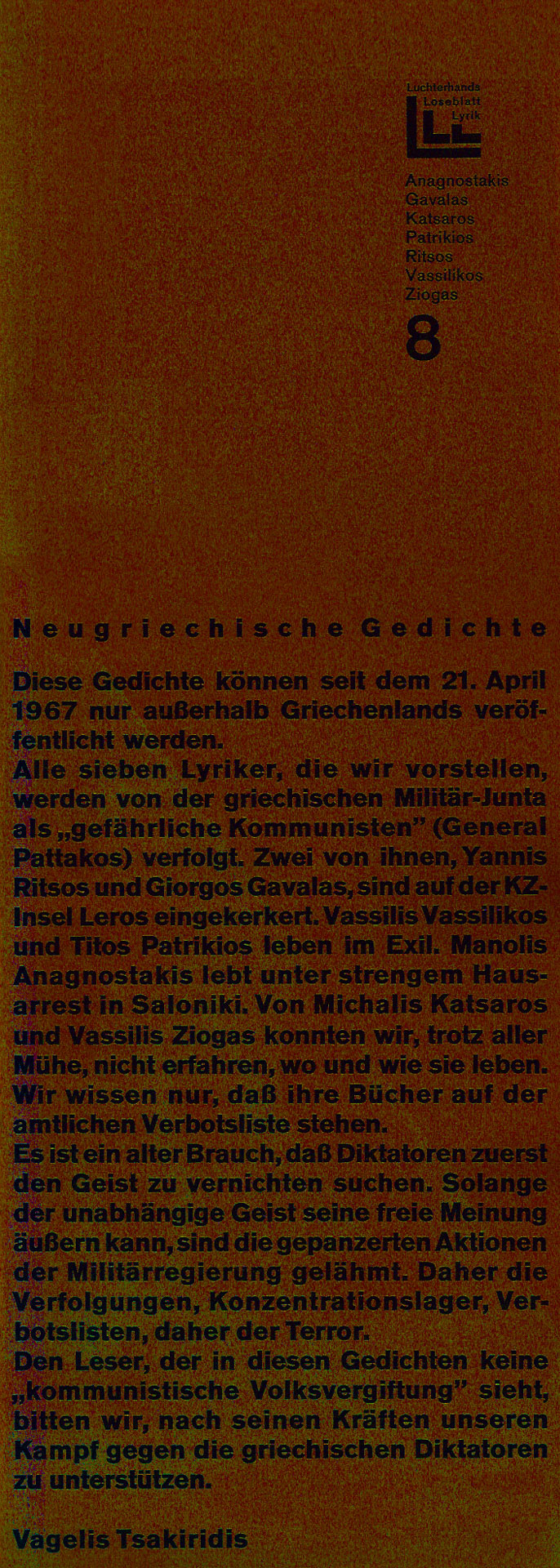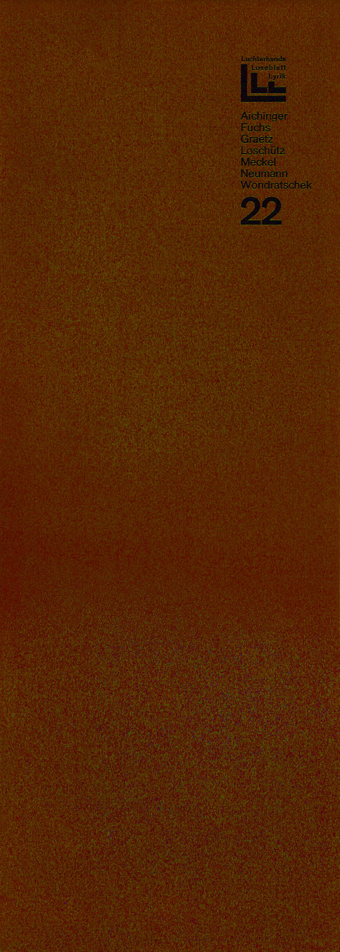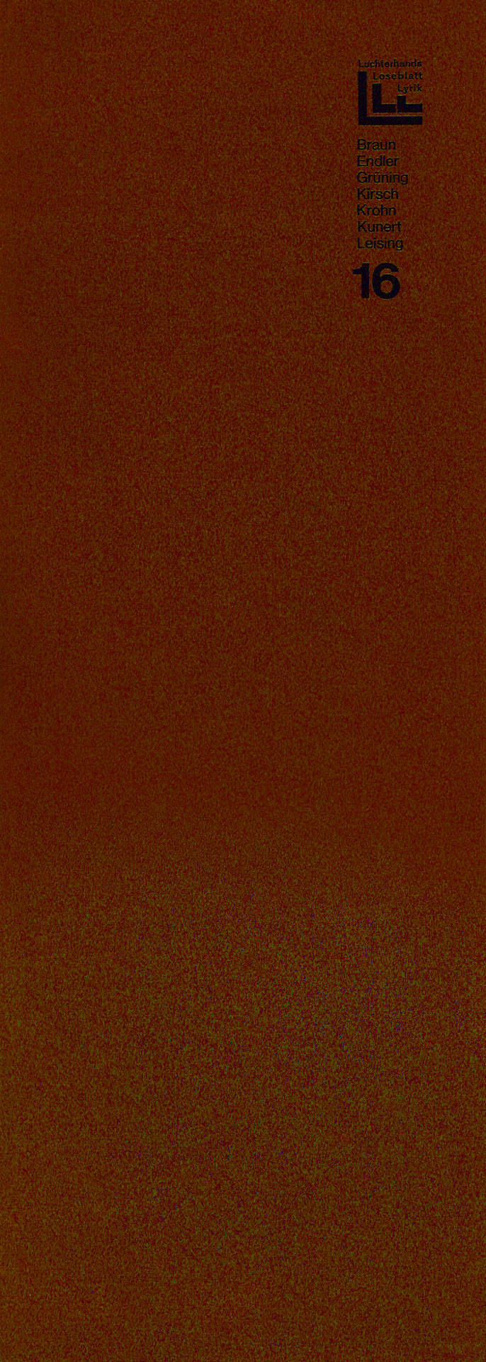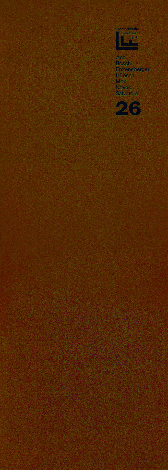 Von September 1966 bis November 1970 gab der Luchterhandverlag alle 2 Monate unter der Herausgeberschaft von Elisabeth Borchers, Klaus Roehler und Günter Grass eine Mappe mit jeweils 7 GedichtGrafikBlättern heraus. Konstantin Ulmer beschrieb das Projekt sehr ausführlich in seinem Buch VEB Luchterhand? Das Autoren-, Übersetzer- und Grafikerverzeichnis findet man hier und die einzelnen Mappenbeschreibungen einen Klick weiter. Der 26. Lieferung lag diese Abschlußerklärung bei.