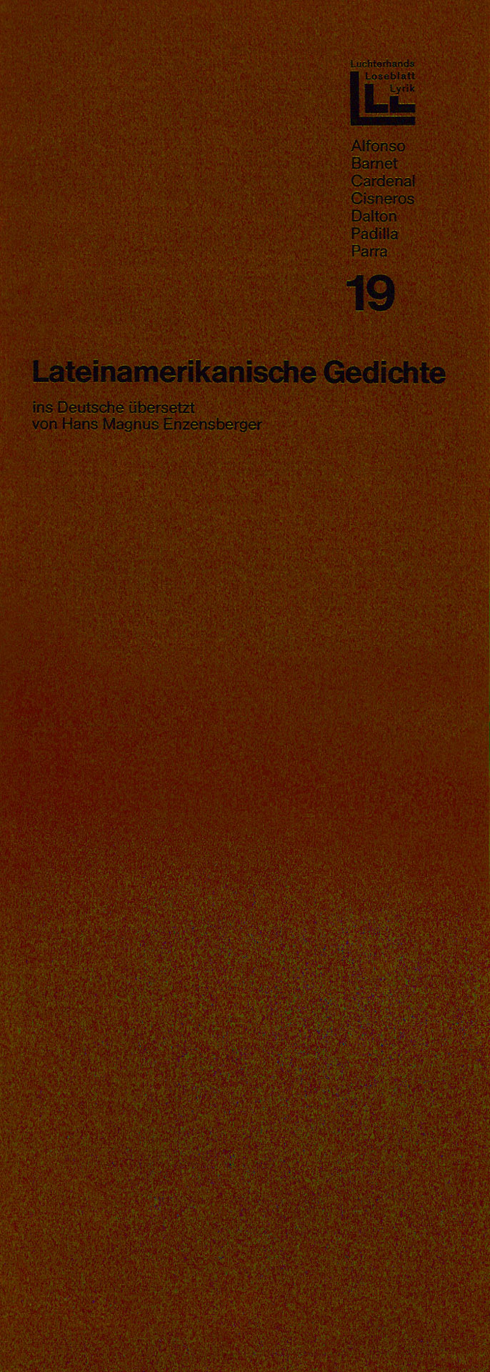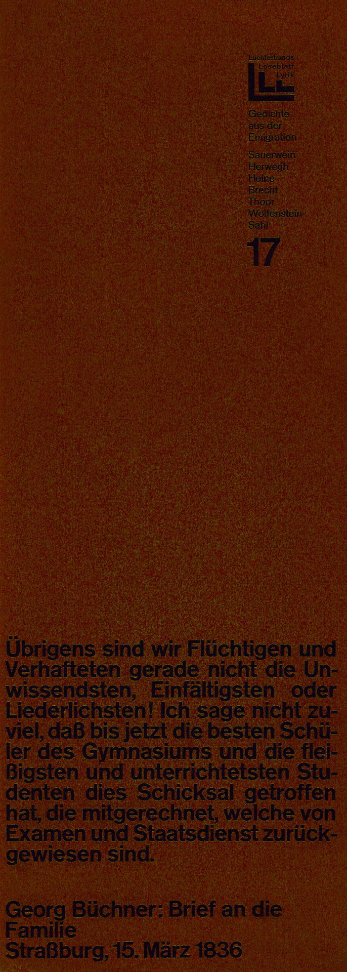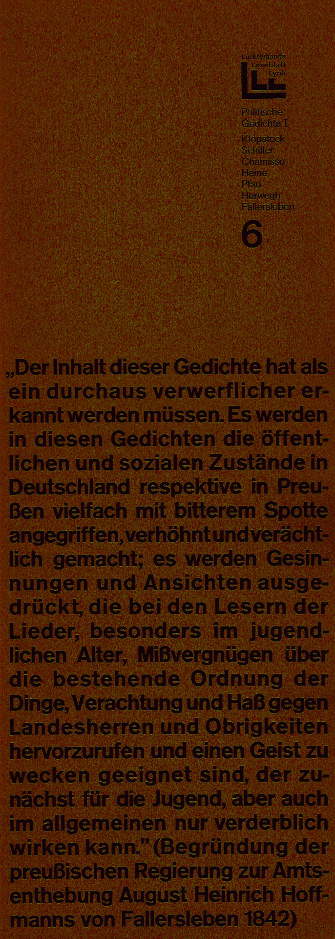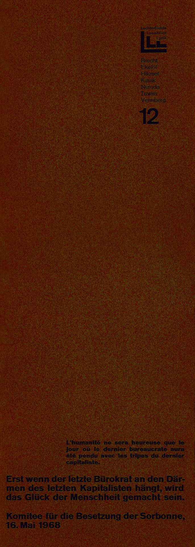 Von September 1966 bis November 1970 gab der Luchterhandverlag alle 2 Monate unter der Herausgeberschaft von Elisabeth Borchers, Klaus Roehler und Günter Grass eine Mappe mit jeweils 7 GedichtGrafikBlättern heraus. Konstantin Ulmer beschrieb das Projekt sehr ausführlich in seinem Buch VEB Luchterhand? Das Autoren-, Übersetzer- und Grafikerverzeichnis findet man hier und die einzelnen Mappenbeschreibungen einen Klick weiter. Der 26. Lieferung lag diese Abschlußerklärung bei.