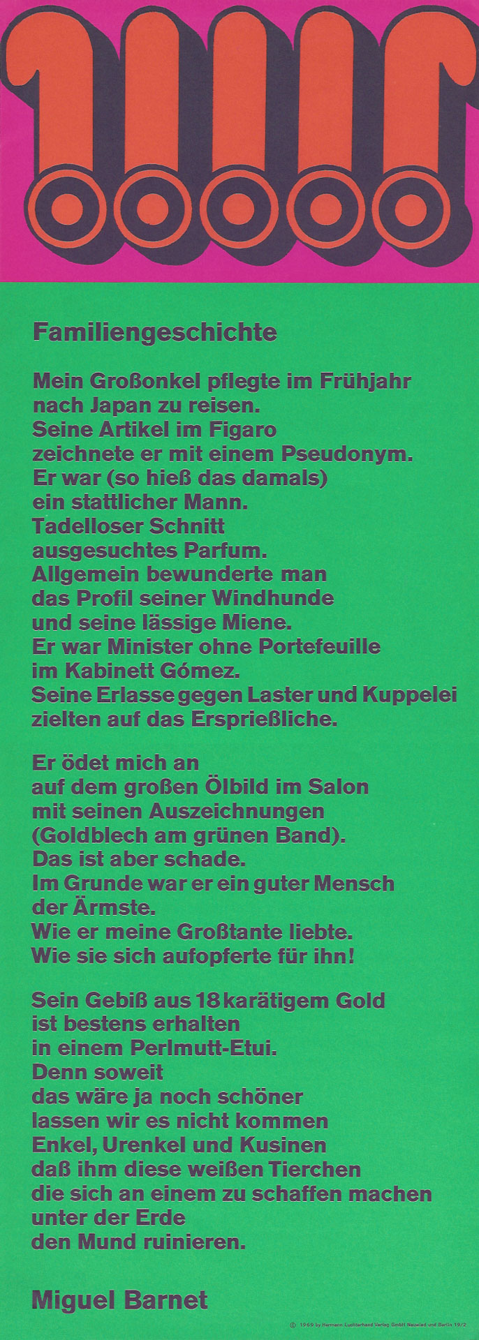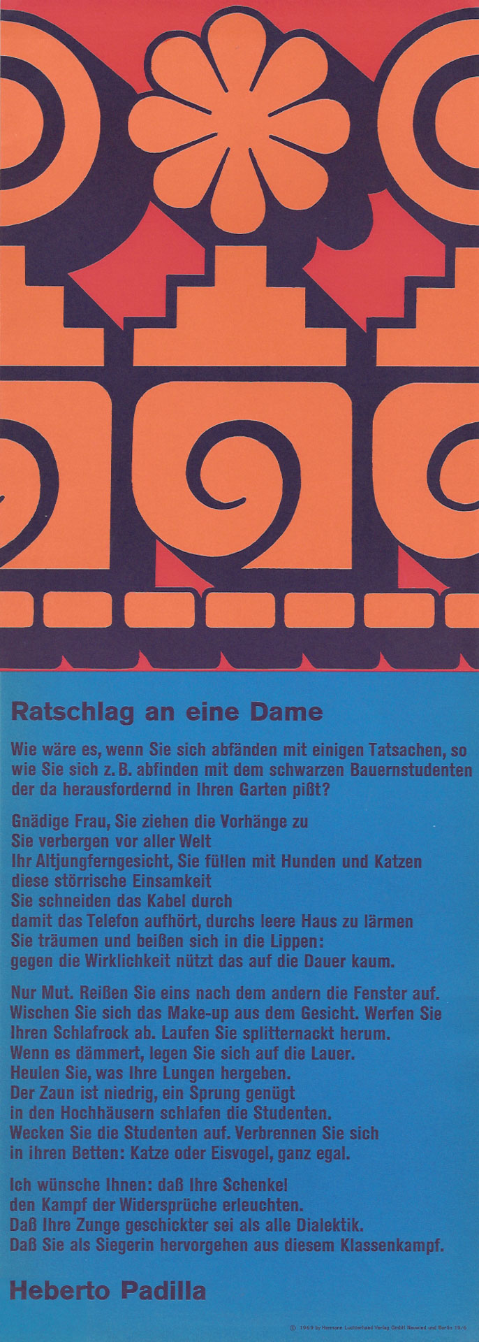 Mappe mit sieben Gedichten auf losen, langen, auch als typographischer Wandschmuck brauchbaren Blättern, die nach Wolf Biermanns Erinnerung vom 14. Mai 2011 als lyrische Hingucker „in jeder linksalternaiven Wohnung hingen“.