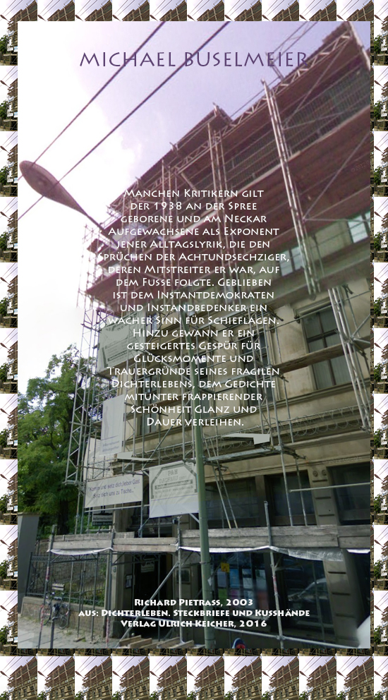 Aktuell ist Michael Buselmeier durch seinen 2012 erschienen Lyrikband Dante deutsch im Gespräch. Er trennt auch nicht zwischen sich und dem lyrischen Ich: