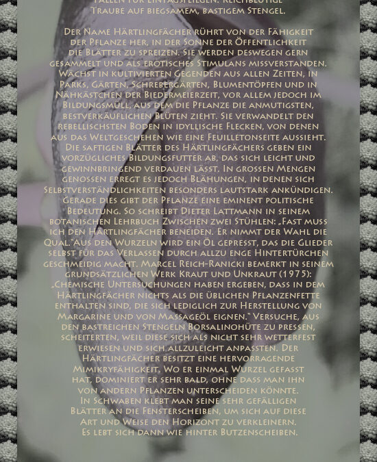 Bild von Juliane Duda mit den Texten von Fritz Schönborn aus seiner Deutschen Dichterflora. Hier „Härtlingfächer“.